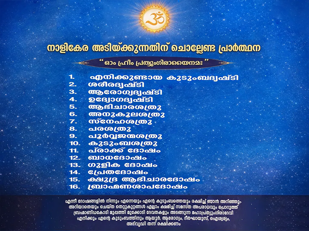Brahmapuram Sree Mahalakshmi Pratyangira Devi Temple is a sacred space where fierce protection and divine nourishment meet. Rooted in ancient ritual and lived compassion, the temple is known for its unique One Coconut Offering, believed to clear deep-seated afflictions. It is a place of transformation; not through grandeur, but through sincere prayer, daily discipline, and support that continues beyond pooja. The temple serves both spiritual seekers and those in need, offering ritual, guidance, and community care.